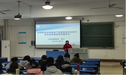11月8日下午,永利集团304am登录副教授郭云老师在锦绣校区逸夫楼A602教室举行了主题为“区域联动协同视角下安徽自贸区合肥片区科技金融创新发展研究”的学术报告,2020级国际经济与贸易专业的学生到场聆听了报告。