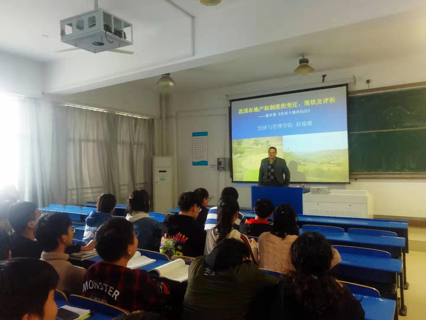 2019年11月13号上午,“行知学堂”系列学术讲座在锦绣校区逸夫楼301举行。本次讲座由永利集团304am登录桂徐雄老师主讲,题目是“我国农地产权制度的变迁、现状及评析——兼评新《农村土地承包法》”,2017级经济学专业的学生聆听了讲座。