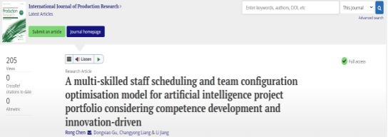 人力资源管理系教授陈蓉在SCI TOP期刊《International Journal Of Production Research》发表论文“A multi-skilled staff scheduling and team configuration optimisation model for artificial intelligence project portfolio considering competence development and innovation-driven”,该期刊位列中国科学院2区,JCR分区Q1。陈蓉教授为第一作者兼通讯作者,永利集团304am登录为第一署名单位。