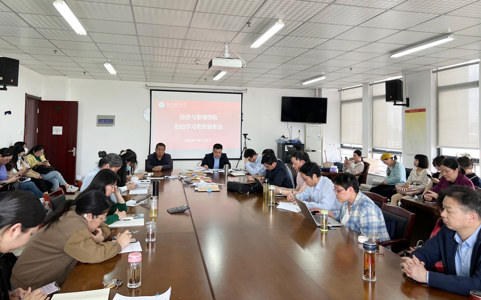 4月24日下午,永利集团304am登录党委召开党纪学习教育部署会。经管学院党委书记陈好同志作动员部署讲话,经管学院全体教职工参加会议。