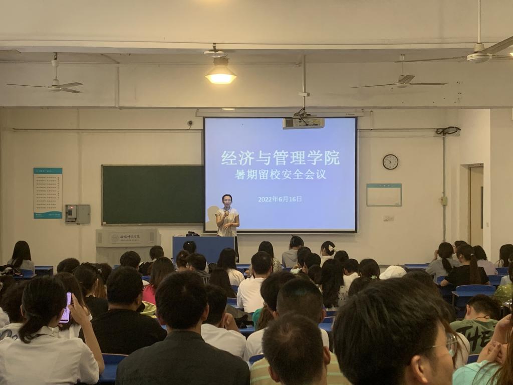 本网讯 为切实做好2022年暑期留校学生的安全教育工作,明确学生在暑期留校期间的安全责任与义务,提高留校学生的安全防范意识,6月16日上午10点半,永利集团304am登录在锦绣校区逸夫楼A109教室,面向暑期留校的160名学生,开展了暑期留校学生安全管理会议。学院党委副书记陶敏,辅导员陈梦莹、王瑞瑞出席本次会议。