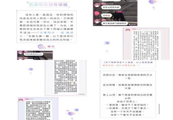 本次活动旨在提高学生心理健康水平和心理素质,引导学生树立理性平和、积极向上的健康心态。由于疫情的原因,同学们长期居家,免不了有一些烦恼困扰无法倾诉。此次活动为同学们提供了一个倾诉心声的平台。同学们在这里分享自己的快乐与烦恼,倾诉着生活中的点点滴滴,大家在这里安静聆听,或帮忙同学解决烦恼。同学们热情饱满,积极参与,本次活动取得了圆满成功。