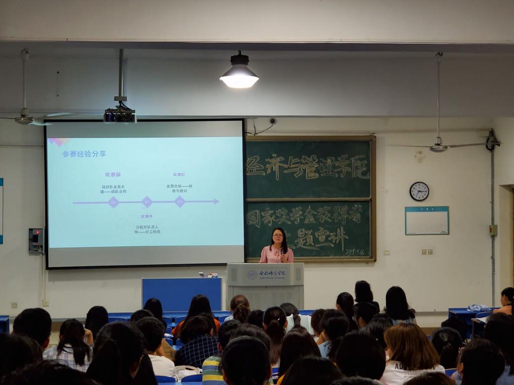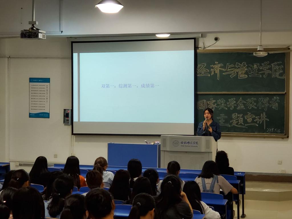 5月16日晚7点,永利集团304am登录在逸夫楼A301教室举行“出彩合师”——永利集团304am登录2018年“国家奖学金”获得者宣讲活动。来自2015级财务管理专业的卢敏同学、2016级经济学专业的胡悦同学为我院同学作报告。院党总支副书记陶敏及学院2018级部分专业同学参加了此次宣讲会。宣讲会由辅导员谷跃东老师主持。