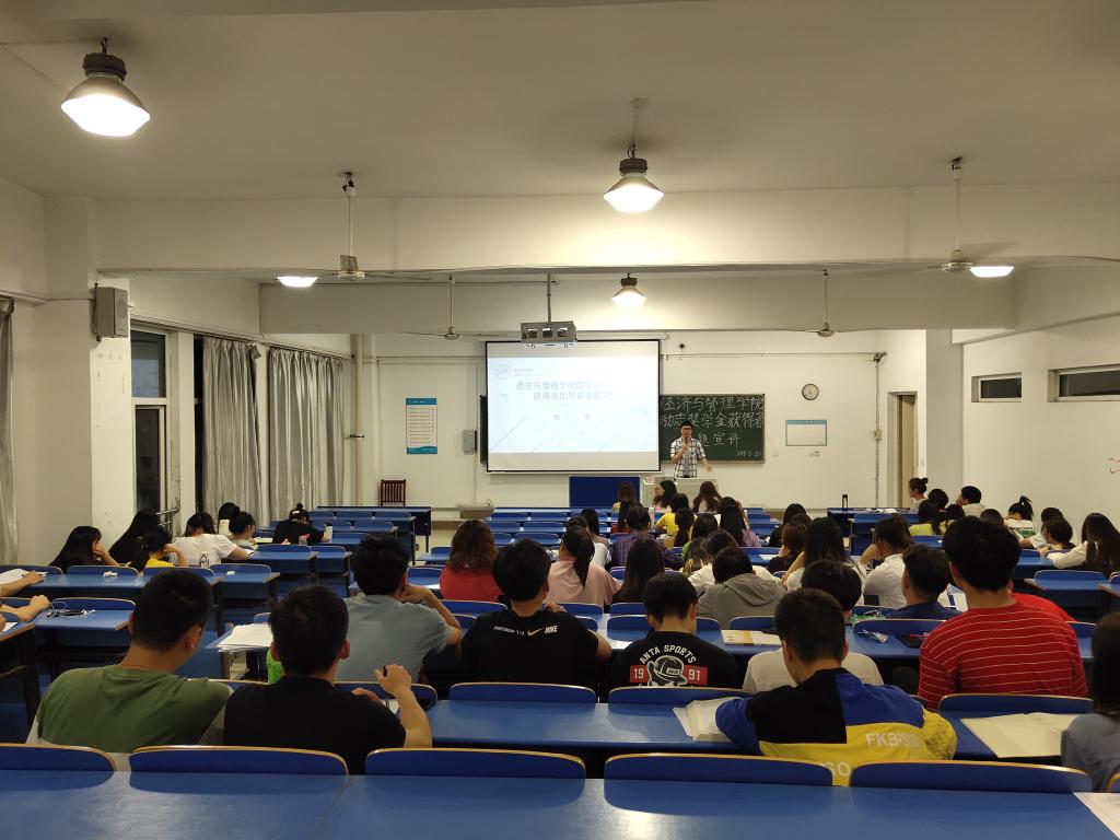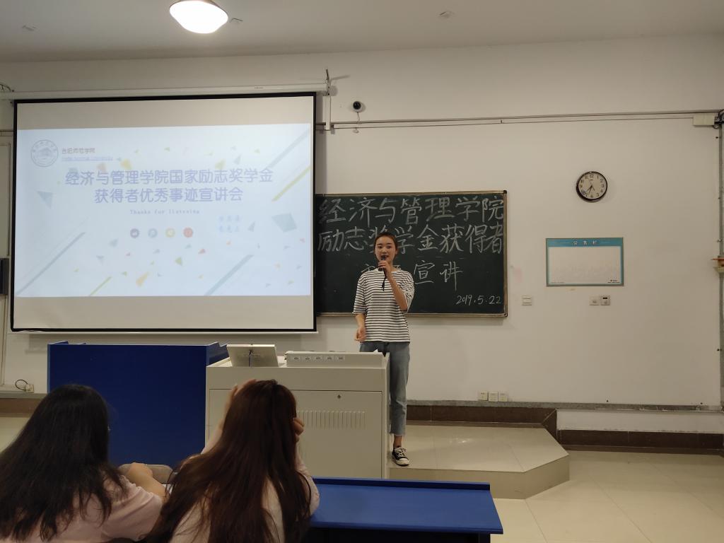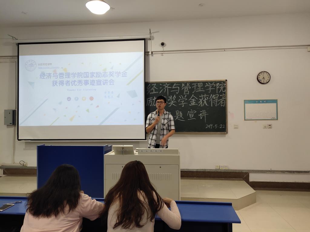 5月22日晚7点,永利集团304am登录在逸夫楼A303教室举行“出彩合师”——永利集团304am登录2018年“国家励志奖学金”获得者宣讲活动。来自2017级酒店管理专业的袁志立同学、黄奕朵同学为我院同学作报告。学院2018级部分专业同学参加了此次宣讲会。宣讲会由辅导员谷跃东老师主持。