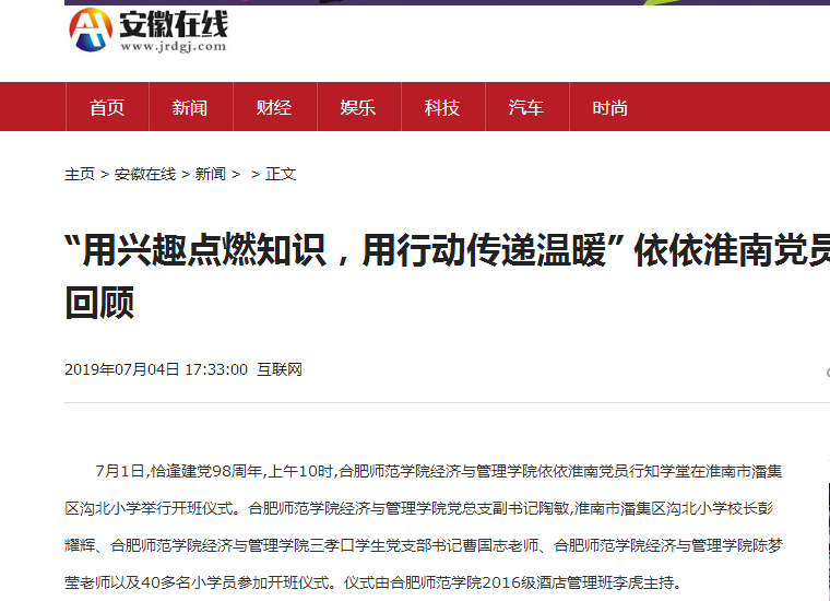 7月4日,安徽在线报道我院“依依”党员行知学堂实践活动。(永利集团304am登录)
